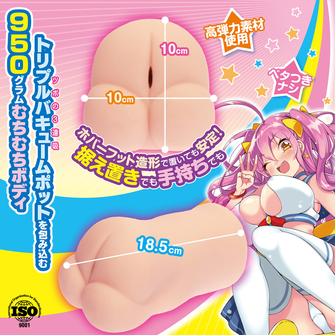 トリプル個性(斜ヒダ、横ヒダ、縦ヒダ)の3連バキュームポットは空気を抜くことで、より深い吸いつき感が味わえます。ひとコキで3度おいしい!