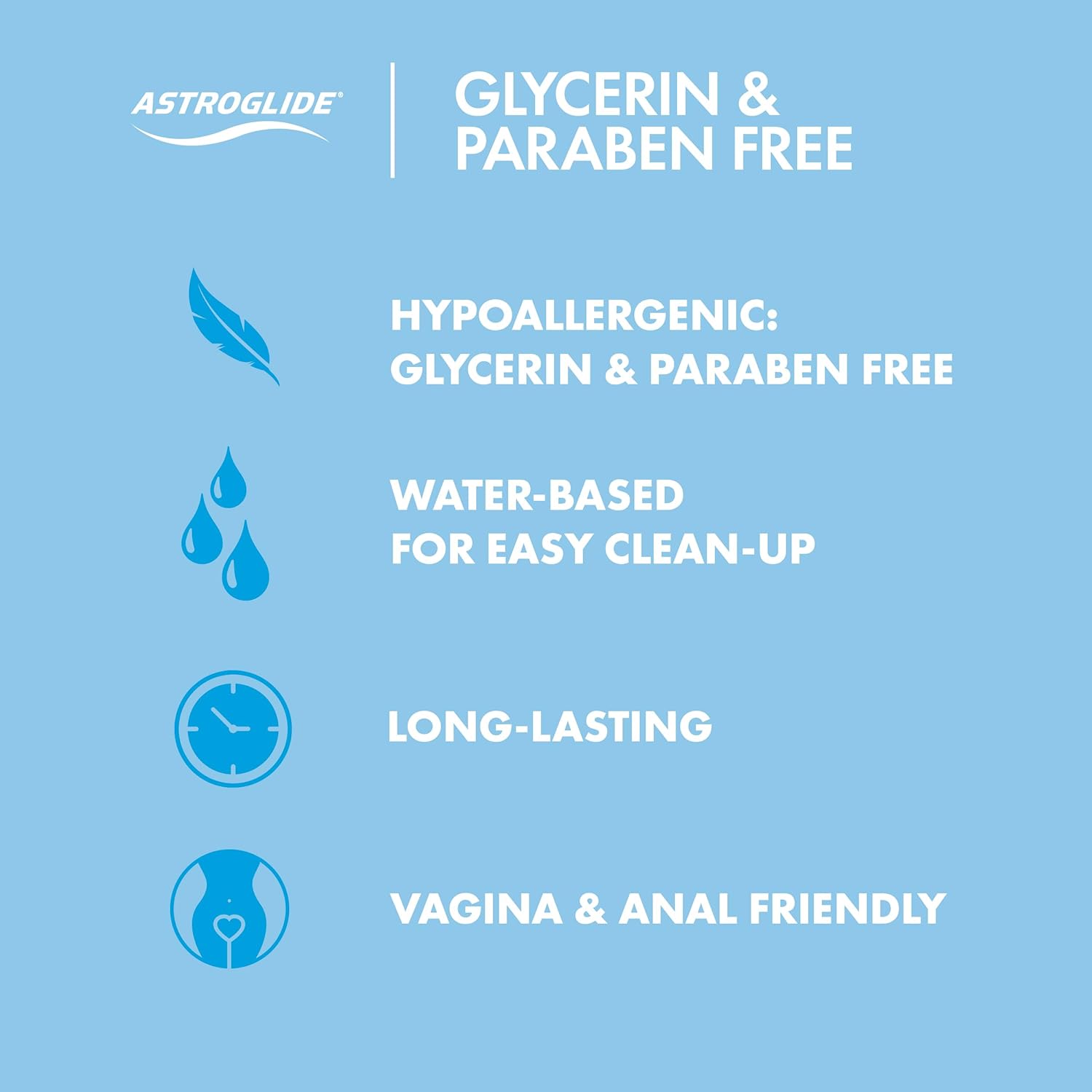 アストログライド独自の低刺激フォーミュラはグリセリン、パラベンに対して敏感な方に最高の選択肢です。より満足度の高いセックスに導くだけでなく、セックス中の不安を緩和いたします。水溶性のこの製品はベタつかず簡単に洗い流せて、大人のおもちゃやコンドームと安心してご使用出来る幅広いニーズに対応するマルチな製品です。
