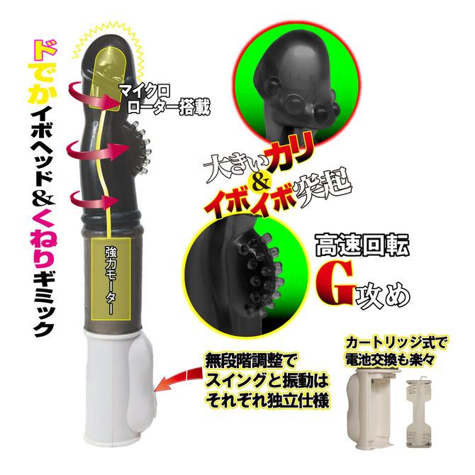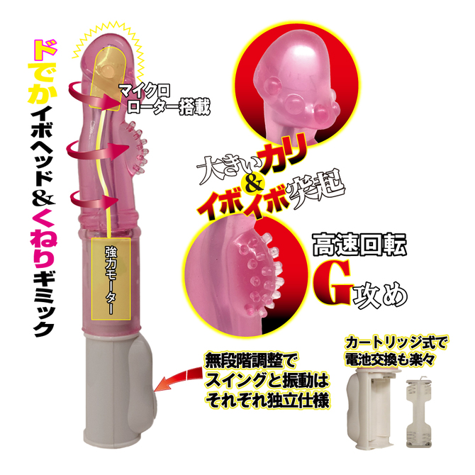 カ●の下には、G攻め用のイボイボ突起の集団が待ちかまえる。リズム感ばっちりのくねりギミック&6Vパワーの高速回転、刺激の応酬で潮吹き激イキ間違いなし!