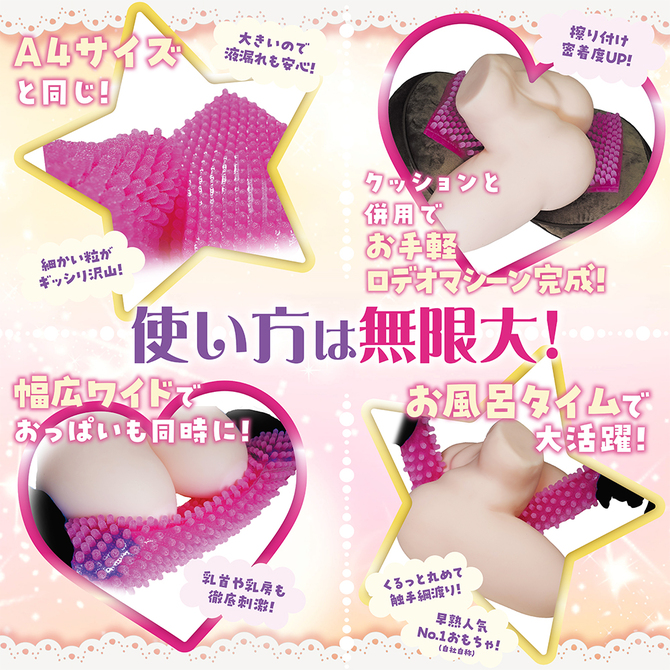 表面の凹凸を擦り付けて使用する「オナシート」というジャンルのグッズがありますが、なぜかきまって手のひらサイズ。その使い勝手はお世辞にもよいとは言えず、快感よりもストレスがたまるものでした。