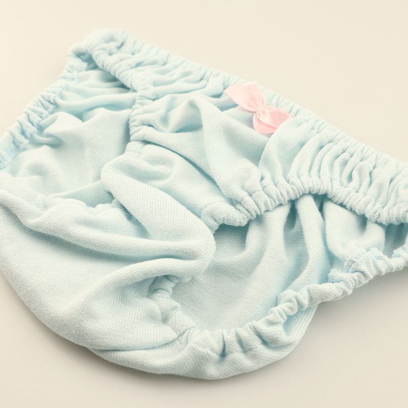 通気性が良く、肌にやさしい柔らかさが特徴のコットン100%生地を使用したフルバックショーツです。身生地は肌馴染みがよく、長時間の着用でも快適な履き心地を実現。ウエスト部分は小さなくしゅくしゅとしたインゴム縫製で、可愛らしいアクセントをプラスしています。見た目はコンパクトで愛らしく、それでいてしっかりフィットする小さなスキャンティデザイン。シンプルながらも可愛らしさと快適さを兼ね備えた一枚です。置き寸で股上約12.5cm。