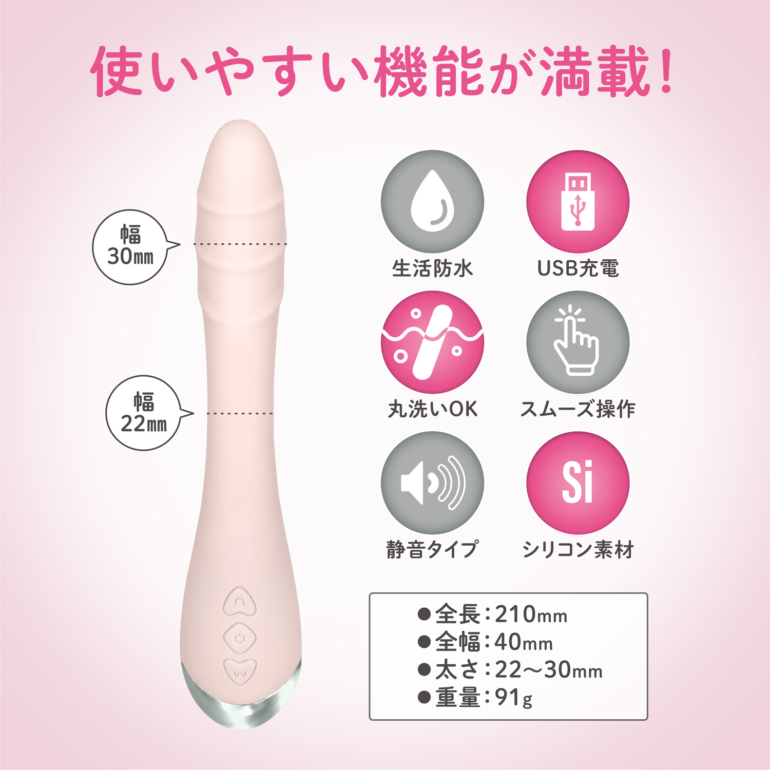 太さは最大30mmシリコン素材で肌触りも非常によく静音タイプなので周りを気にせず使用頂けます。