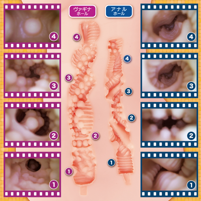 イボ螺旋・ヒダ螺旋など、快感特性が異なるふたつの穴をあなたのお好みに育成してください。