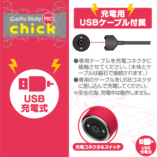 マグネット式の充電用USBケーブルが付属しておりますのでご家庭の環境で充電可能。