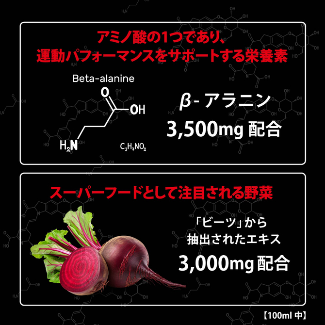 勝負の前のドリンク「百戦錬磨FLASH」アミノ酸の1つであり、運動パフォーマンスをサポートする栄養素「β-アラニン」を3,500mg配合。