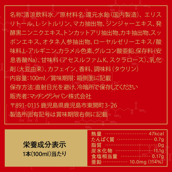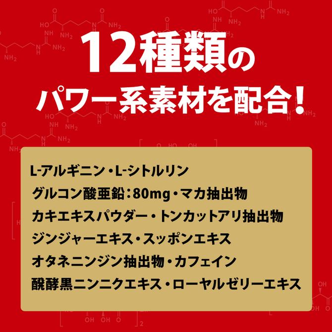 勝負の前のドリンク「百戦錬磨POWER」L-アルギニン・L-シトルリン・グルコン酸亜鉛:80mg・マカ抽出物・カキエキスパウダー・トンカットアリ抽出物・ジンジャーエキス・スッポンエキス・オタネニンジン抽出物・カフェイン・醗酵黒ニンニクエキス・ローヤルゼリーエキス この1本に12種類のパワー系素材を贅沢に配合!!