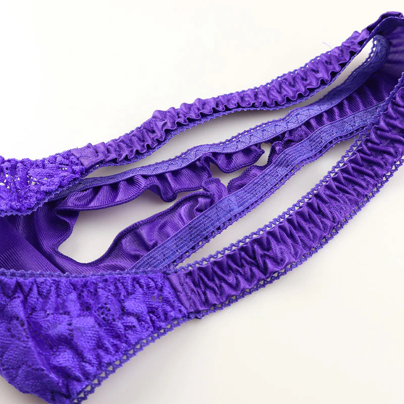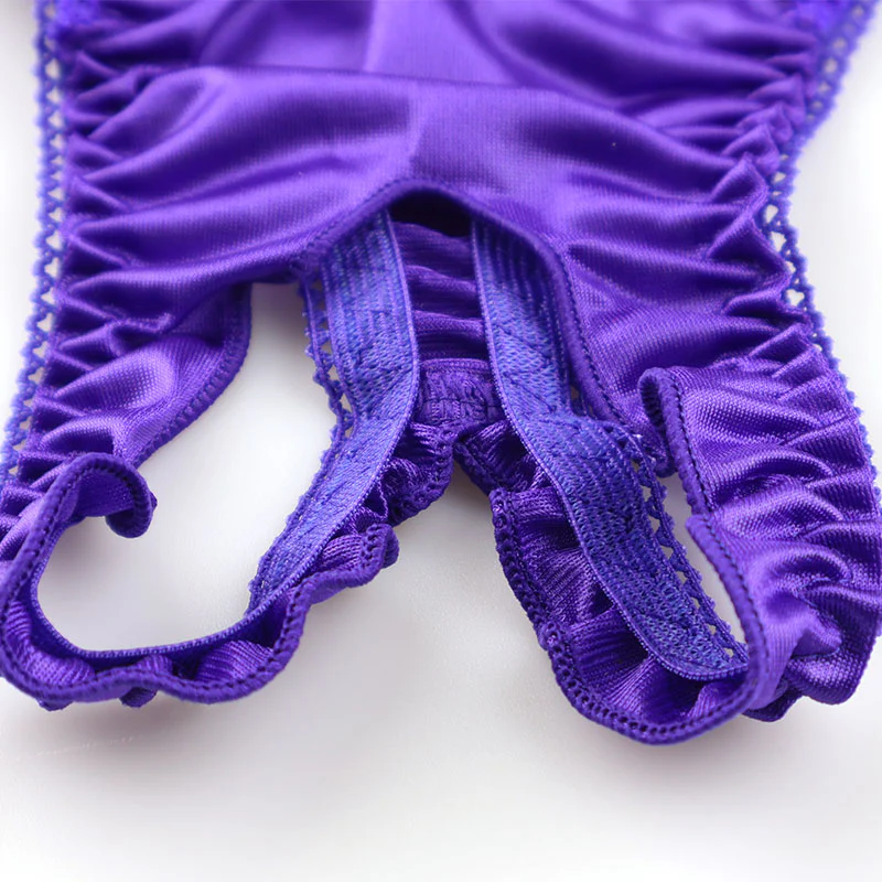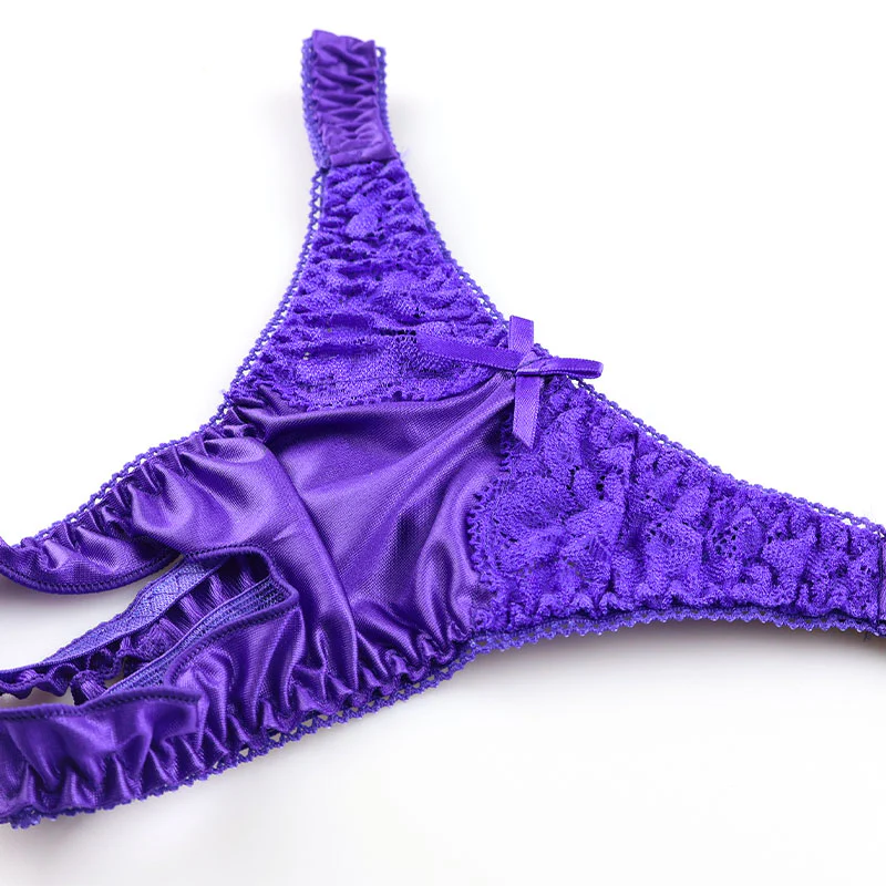 光沢感があり、柔らかくツルツルとした肌触りのフェリカ生地と、透け感のある美しいレースを組み合わせた、セクシーで大胆なデザインのレディースTバックショーツです。大胆なオープンクロッチ(股ワレ)デザインで、魅せるセクシーさを最大限に演出。肌に優しくフィットするフェリカ生地は快適な穿き心地を提供し、透け感のあるレースが上品さと華やかさをプラスします。日常使いはもちろん、特別な日や気分を高めたいシーンにもおすすめ。大胆ながらもスタイリッシュで洗練されたデザインで、後ろ姿まで美しく魅せる一枚です。