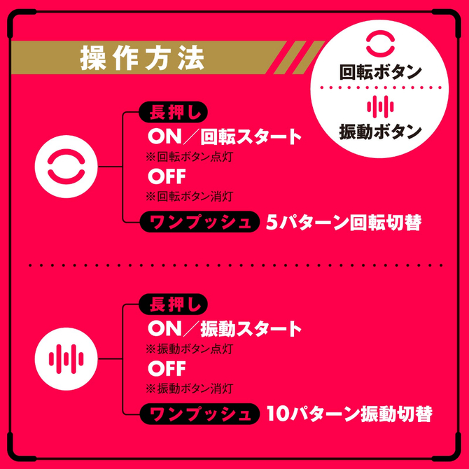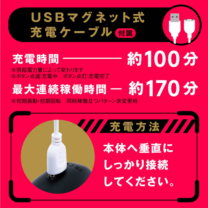 ※本体:充電時間約100分※本体:最大連続稼働時間約170分(初期回転・振動パターン同時稼働且つ未変更時)_IPX7等級_5パターン回転_10パターン振動_付属品:USBマグネット式充電ケーブル検査番号:2502486