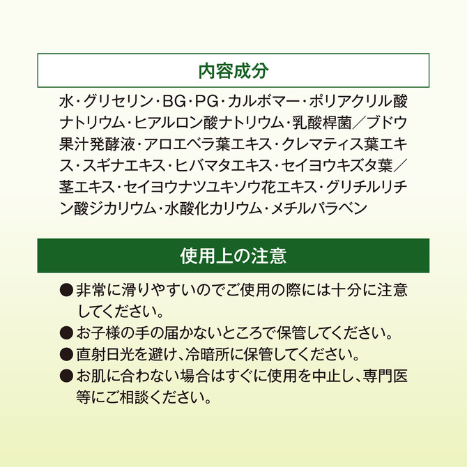 水・グリセリン・BG・PG・カルボマー・ポリアクリル酸ナトリウム・ヒアルロン酸ナトリウム・乳酸桿菌/ブドウ果汁発酵液・アロエベラ葉エキス・クレマティス葉エキス・スギナエキス・ヒバマタエキス・セイヨウキズタ葉/茎エキス・セイヨウナツユキソウ花エキス・グリチルリチン酸ジカリウム・水酸化カリウム・メチルパラベン