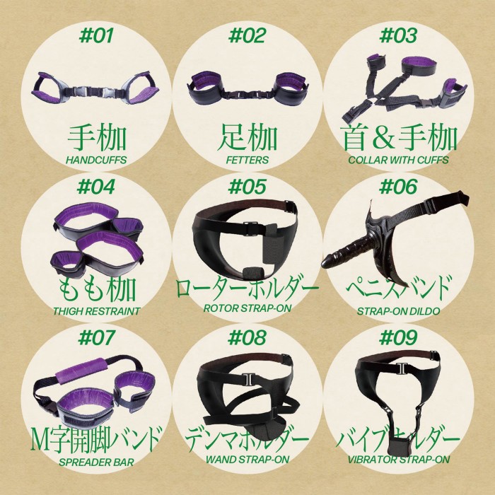 拡張性も高く、〈手枷〉〈足枷〉〈M字開脚〉を合体させたり、〈首&手枷〉の十字ベルトと組みあわせたりと、プレイの幅を広げられます。