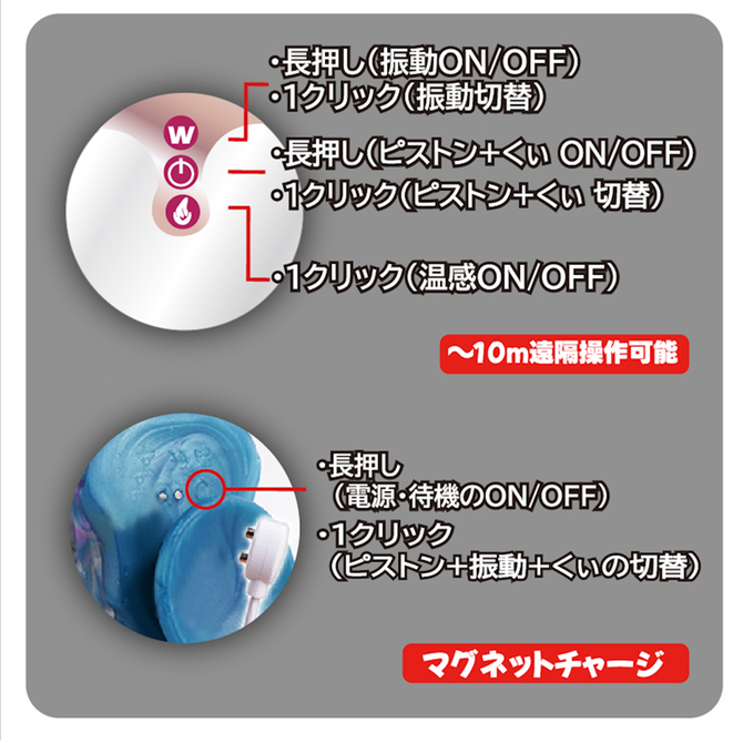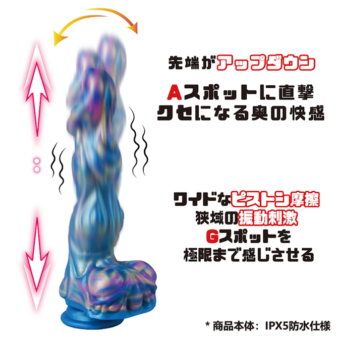 異様な形の突起物がち●の中を複雑に刺激し今までのバイブでは体験出来ない刺激が感じられます。10種類回転ピストンx10種類振動=100種類パターン!