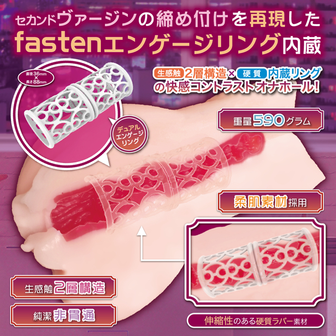 ヴァギナ・モノローグスはセカンドヴァージンの締め付けを再現する「fastenエンゲージリング」をデュアルで内蔵したオナホールです。